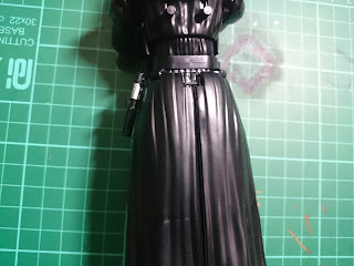 Now the lower robe. Take the two halves of it and clip it unto the clips at the side of Darth's torso and peg the stored beam saber to the side.